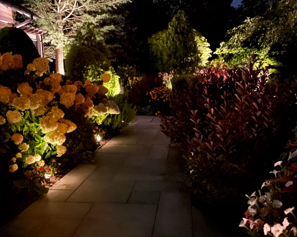 Strategic accent lighting highlights garden beds, specimen trees, and layered planting areas. This adds depth and texture so your landscaping doesn’t disappear after sunset.